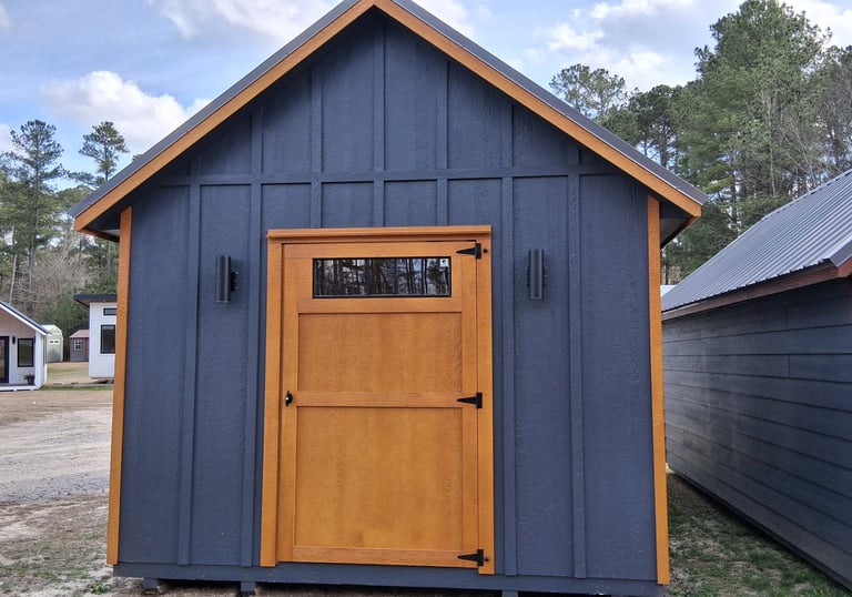 A 10x16 high-wall modern shed featuring LP Smartside Performance Panel in Naval color, accentuated with Snow Bound trim. It includes two 2x3 windows, four transom windows, and a double wood door fitted with a transom. Comes with a basic electric package.