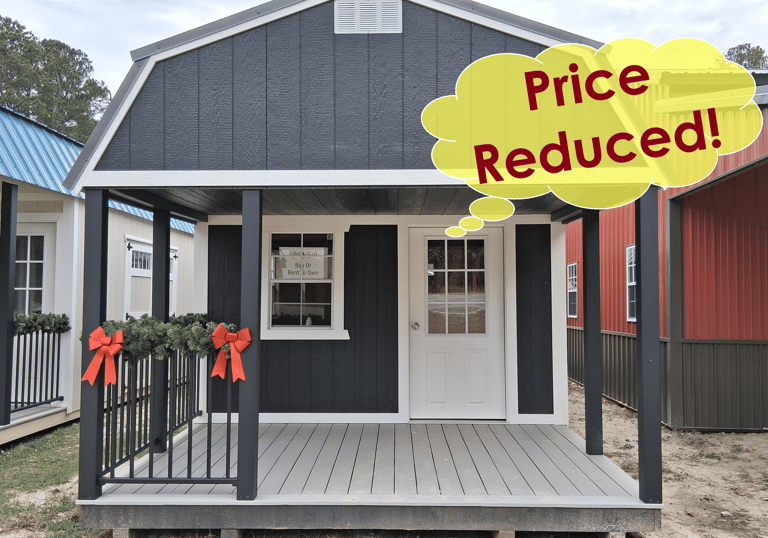 Stunning 12x20 Cambridge with 6ft Chalet Porch! This shed is stunning in Snow Bound with Snow White trim & Charcoal metal roof. Includes Pro Electrical Package, glass door, 2 picture windows, 4 insulated windows and 72” transom. Interior with wide pine ceilings and shiplap walls and featuring a wood accent wall.